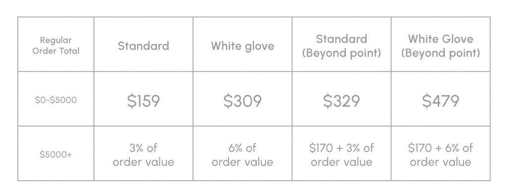 Standard shipping includes a delivery to the threshold, described as the "first dry area or garage", or lobby/service area of a high-rise building. White Glove service includes an in-home delivery appointment, up to 1 flight of stairs, assembly and removal of large packaging materials. If you are considering a return please request to keep the packaging.